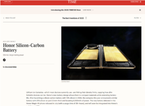 TIME je pohvalio ovaj tehnički napredak, navodeći: „Novi dizajn baterije brenda HONOR omogućava kompaktno korišćenje materijala uz produžen vek trajanja baterije.“ HONOR-ova najnovija silicijum-ugljenična baterija, koja sadrži 25% silicijuma, debela je samo 2,3 mm i ima kapacitet od 6.100 mAh, a nedavno je predstavljena na HONOR Magic V5, najtanjem preklopnom telefonu na svetu.
